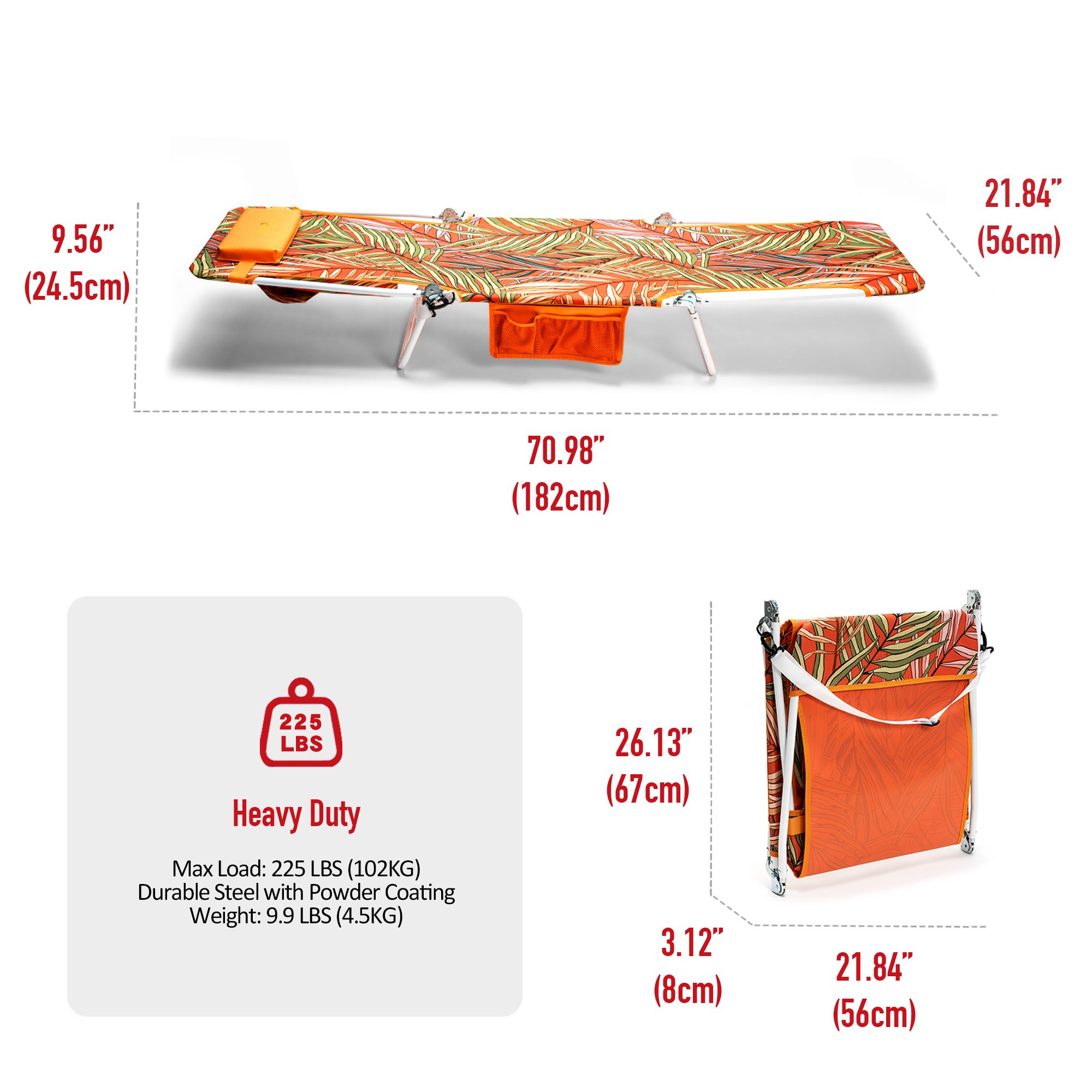 Built to Last: The sturdy steel frame construction affords up to 225 LBS (102 KG) weight capacity and the beach chair weights 9.9 LBS (4.5 KG). The double-seam 600x300D xford fabric has great strength, durability and breathability.Easy to Use: This reclining camping chair is easy to setup and fold up. You can transport it to camp, lawn, concerts and festivals with the attached shoulder strap.