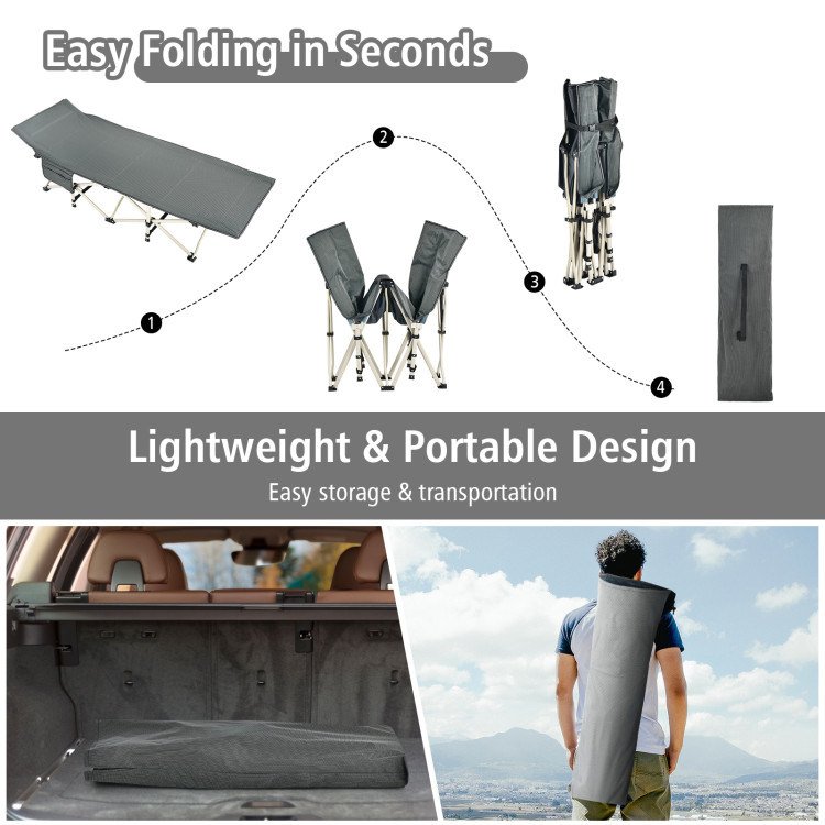 ● Easy Folding and Carrying: The lightweight and portable sleeping bed can be folded and unfolded in seconds with no tools required, and designed with a carrying bag for convenient storage and transportation. Besides, there exists a spacious side storage pocket to store your water bottles, phones, keys, sunglasses, books, and more.