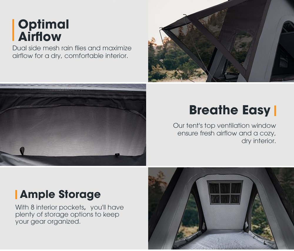 Comfortable Interior: Our Kalbarri Lite RTT provides a spacious interior (207x117cm) perfect for a family of three, with high-density 5cm thick foam mattress for extra comfort.